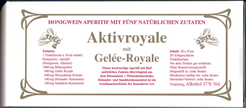 - Honigwein Aperitif mit fünf natürlichen Zutaten 20 Trinkfläschchen à 10ml 1 Trinkflasche enthält: Honigwein-Aperitif (Honigwein, Alkohol) 1000 mg Blütenpollen 400 mg Gelee Royale 400 mg Weizenkeim-Extrakt 100 mg Holunder-Konzentrat 100 mg Sanddorn-Konzentrat Dieser hochwertige Aperitif mit fünf natürlichen Zutaten